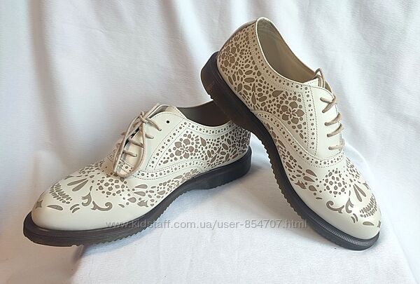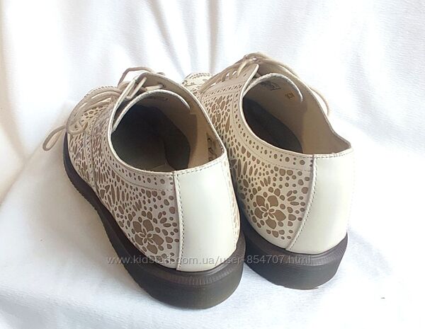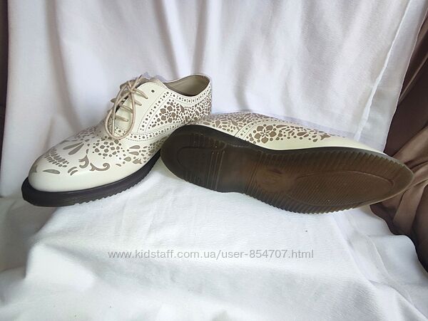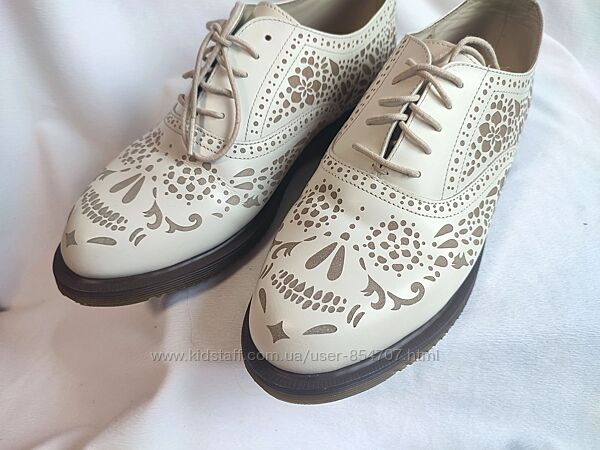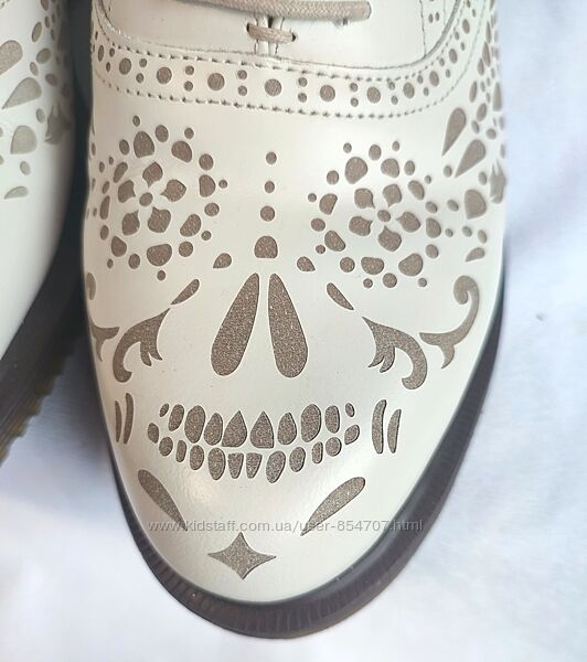 Туфлі жіночі шкіряні Dr. Martens (розмір 40)Модель Kensington Aila виготовлена з якісної натуральної шкіри кольору слонової кістки з гравіюванням черепа. Устілка із натуральної шкіри. На шнурівці. Товста підошва із ПВХ властива бренду Dr.Martens. Розмір 40 (EU 41). Довжина устілки 26,5 см, ширина 9 см.