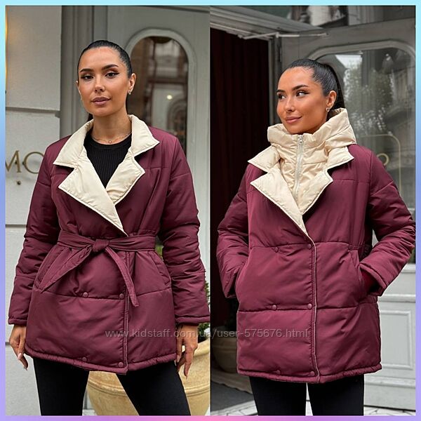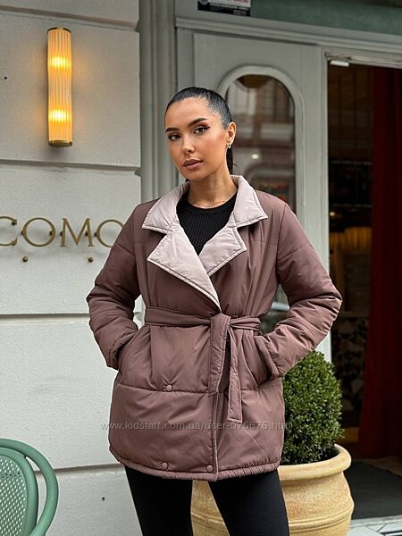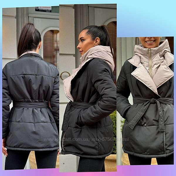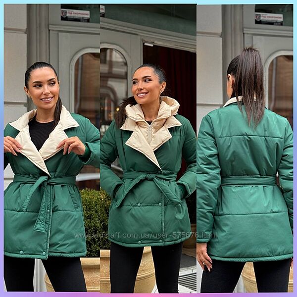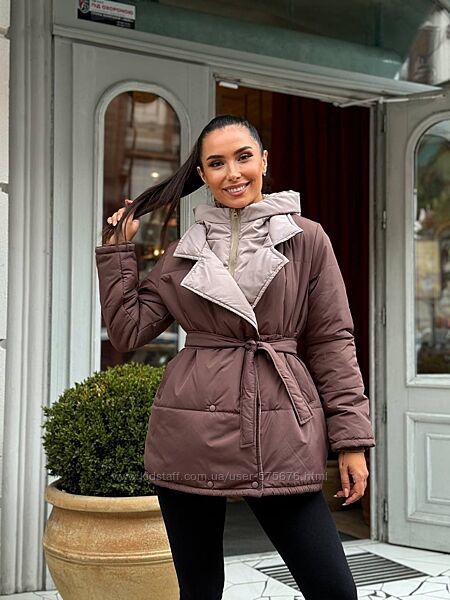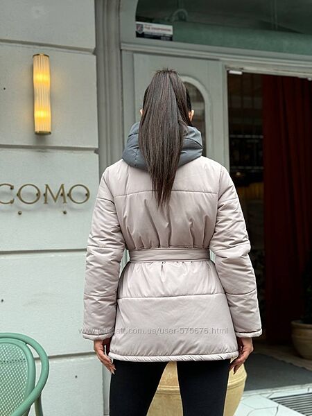 Куртка на змійці та кнопках, з поясом в комплекті. Рукав на манжеті. Капюшон повністю зʼємний разом із передньою вставкою.