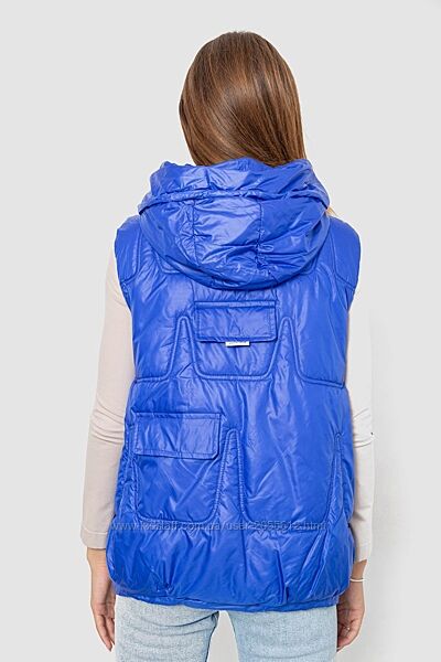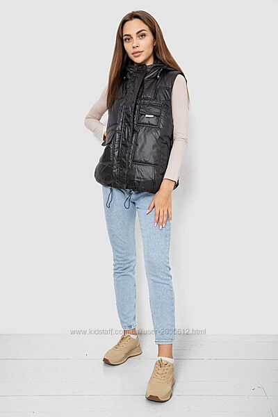 Жилет середньої довжини прямого крою з капюшоном, який не відстібається. Прикрашений карманами різного розміру і виду і декоративною строчкою. Застібається на блискавку і кнопки.Розміри: L, XL, XXL