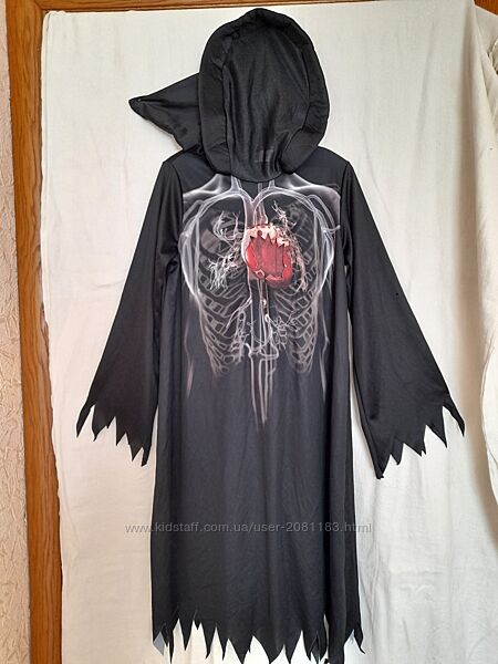 Продам нові і вживані у хорошому стані карнавальні сукні на свято Хеловіна :Фото 1-2 Скелет на дівчинку 9-10років зріст 135-140см. На обличчі чорна сіточка,пришита до капюшону.Фасон оригінальний Є нюанс:під серцем пришита кишенька із батарейкою і лампочками,але вони не світяться із-за давності-сукня рік лежала в шкафу і вони мабуть перегоріли.Зразу,як купили -блимали.Ціна-400грн.