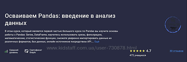 Александр Сидоров Осваиваем Pandas: введение в анализ данных (2024)В этом курсе, который является первой частью большого курса по Pandas вы изучите основы работы с Pandas: Series, DataFrame, научитесь использовать срезы, фильтрацию, математические, статистические функции, сможете уверенно импортировать данные из различных форматов, баз данных, онлайн источников посредством API. Будете решать большое количество практических задачи и укреплять навыки анализа данных. Первая часть большого курса по Pandas.