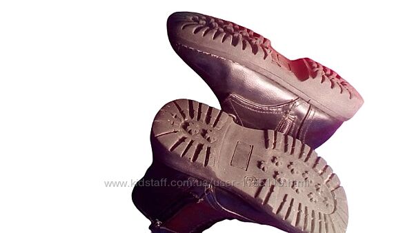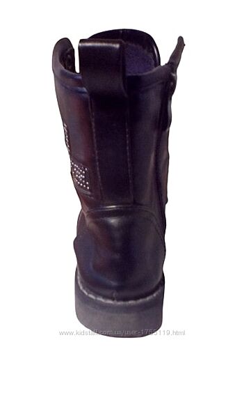 Черевики зі штучним хутром усередині та теплою устілкою. Довжина устілки – 17,5 см. Зав´язуються на шнурки та застібаються на блискавку збоку. Кожен черевик прикрашений стразами. Про недоліки: не всі стрази залишилися на аплікації (див. фото).Склад: Штучна шкіра, усередині - утеплювач.