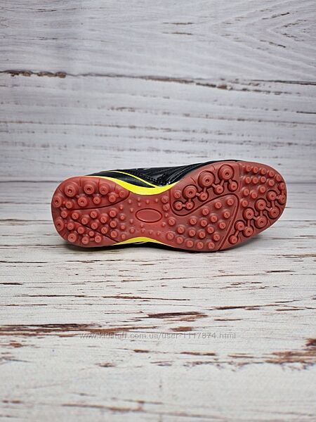 Особливості: підошва з високоякісного зносостійкого гумового з´єднання розробленого для футболу. Спеціальне розташування шипів значно підвищує стійкість під час ігор, забезпечує відмінне зчеплення навіть на вологих поверхнях, максимально розподіляє навантаження на стопу. Шнурки відмінно фіксують ногу, підійдуть на будь-який підйом.