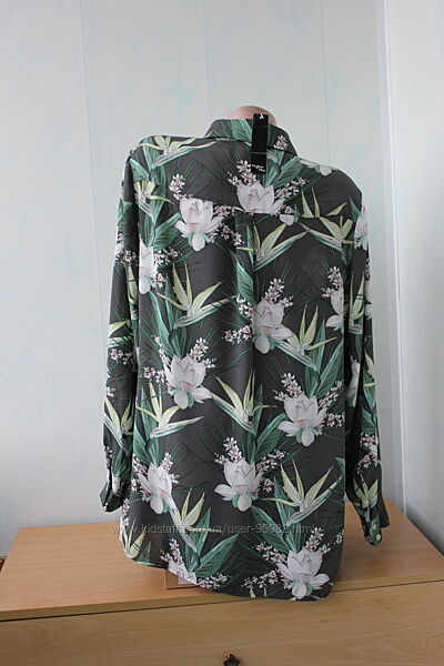 Дуже красива блуза з квітковим принтом, подовжена, дуже якісна, з ґудзиками з натурального перламутру. на бирці розмір 18.НОГ — 59, бб — 61, довжина рукава — 62, довжина по середині спинки, без урахування комірця — 75 см.