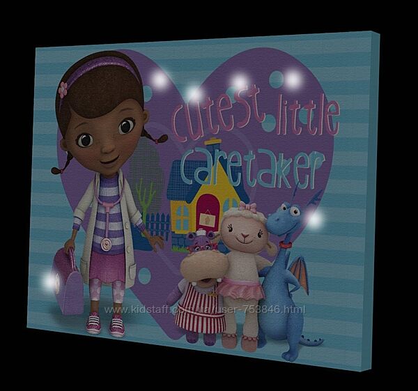Светодиодное настенное искусство на холсте Disney Doc McStuffins, 15,75 x 11,5 дюймовСветодиодные светильники внутри картин на холсте осветят любую детскую комнату, дополняя ее декор. Сборка не требуется – холст легко монтируется. Требуются 2 батарейки АА (не входят в комплект) Размеры: 15,75 дюймов Ш x 11,5 дюймов В