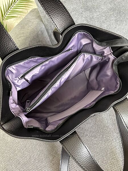 Сумка закривається на блискавку, всередині підкладка, два відділення, по середині перегородка-кишеня на блискавці.