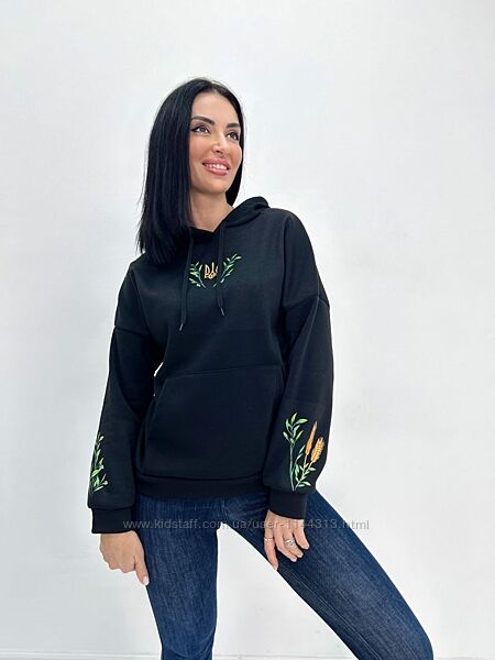 Худі оснащено всім необхідним для комфорту: м´яким капюшоном, просторою кишенею та вільним кроєм, що дає свободу рухам. Манжети на рукавах та талії забезпечують гарну посадку, а просторий крій підійде для будь-якого типу фігури.Патріотичний малюнок на грудях і рукавах не тільки прикрашає худі, а й несе в собі глибокий зміст, висловлюючи почуття гордості та приналежності.