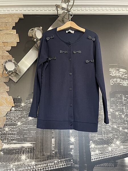 Фото1-6 Дуже гарна якісна дитяча кофтинка на гудзиках в темно синьому кольорі з милими бантиками,склад;95%котон;5%еластан;розмір 152 на 11-12 років;орієнтуйтесь по замірах;Фото7-10 Дуже гарне ошатне дитяче болеро накидка кофтинка бренду C&A,в білому кольорі з перламутровою ниткою,застібається на 1 гудзик;гарно дивиться на тілі;склад:73%котон;17%поліестер;10%металізоване волокно;розмір 152.
