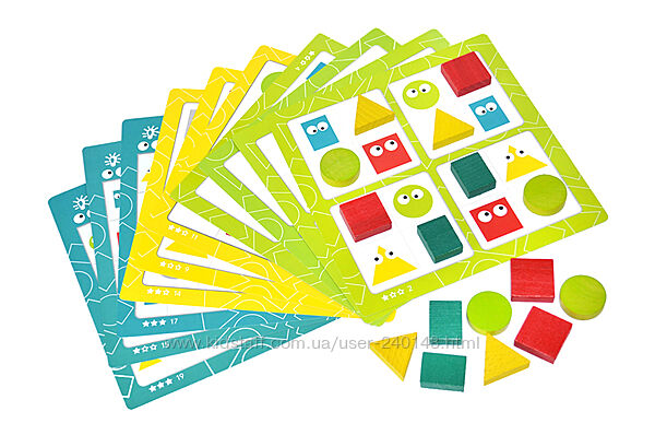 4 види дерев´яних геометричних фігур - трикутники, кола, квадрати, прямокутники (розміри 30х30 мм)20 завдань із різними рівнями складності