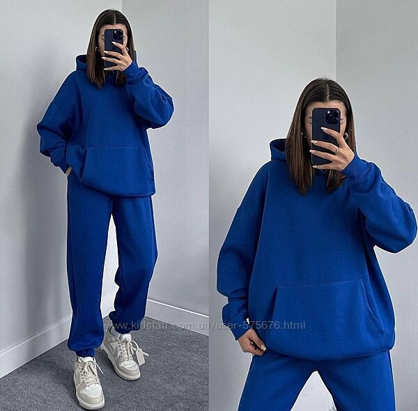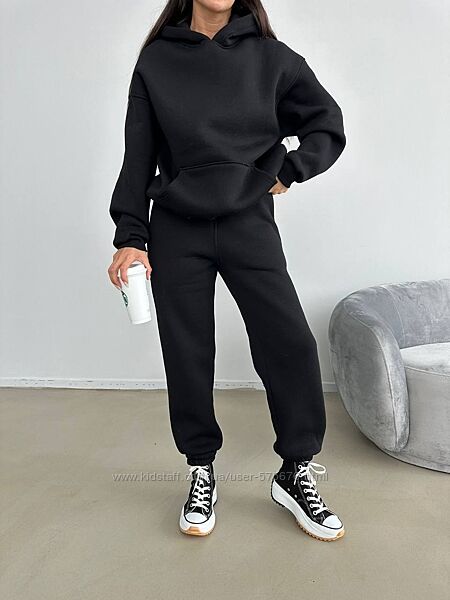 Модель оверсайз, спущені плечі, штани джогери внизу на резинці.