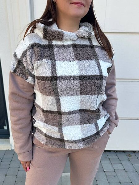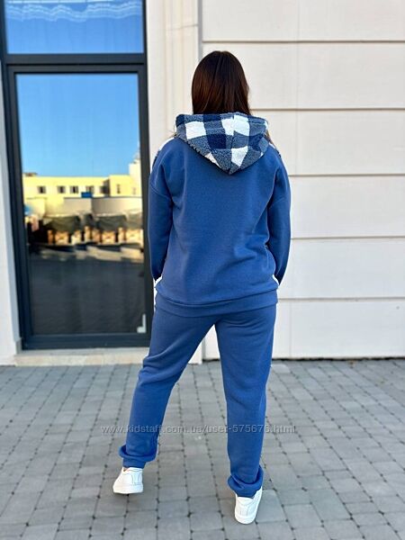 Костюм штани+кофта. Кофта спереду та капюшон хутро «Тедді», рукава,позаду тринитка на флісі. Штани талія на резинці, з кишенями, знизу манжет.