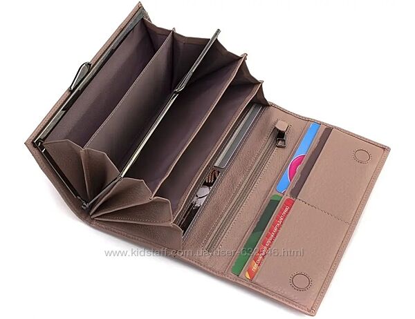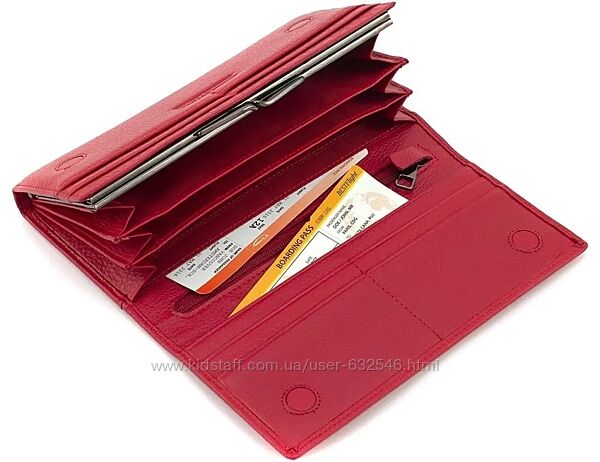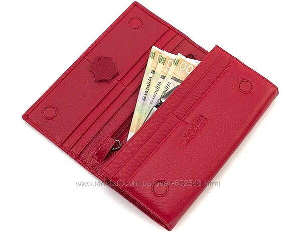 Матеріал: натуральна теляча шкіра Фактура шкіри: Зернистий Колір: Червоний; Розміри: (ШхВхГ): 18,5х9,5х3. Особливості: - три відділення для купюр із розширювачем; - дві кишені на блискавці у перегородці; - дві прилеглі кишені; - дванадцять слотів для пластикових карток; - одна зовнішня кишеня відкритого типу; - одна зовнішня кишеня на блискавці. Всі жіночі гаманці: https://www.kidstaff.com.ua/user-anno-632546/secti...