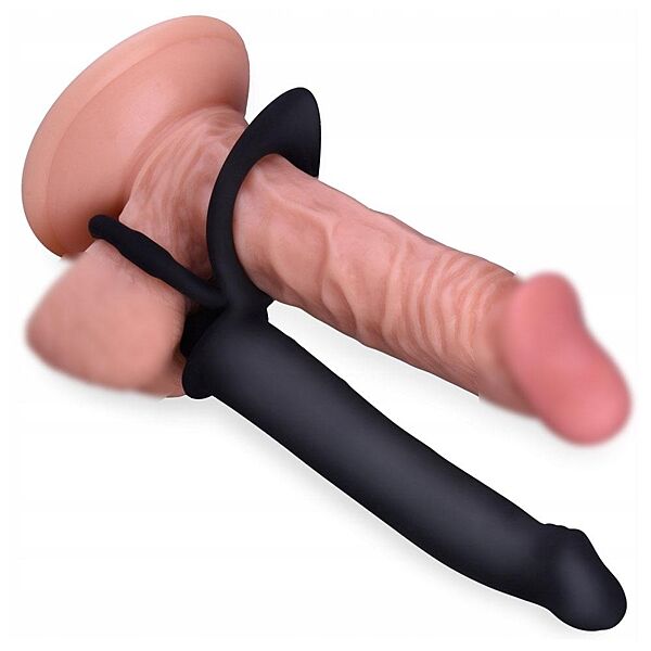 Насадка для подвійного проникнення | Насадка на член | Анальний плаг Насадка кріпиться до члена і мошонці, таким чином щоб фалоімітатор був нижче члена. Під час сексу член проникає вагінально, насадка анально. Насадка має всередині порожнину в яку вставляється вибропуля для додаткової стимуляції, перевага полягає в тому, що вибропулю можна використовувати і окремо, для стимуляції клітора, анально або вагінально.