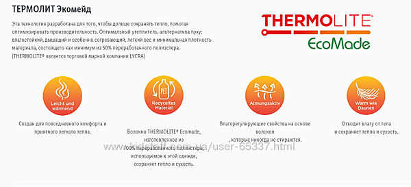 Утеплитель - ТЕРМОЛИТ ЭкомейдЭта технология разработана для того, чтобы дольше сохранять тепло, помогая оптимизировать производительность. Оптимальный утеплитель, альтернатива пуху: влагостойкий, дышащий и особенно согревающий, легкий вес и минимальная плотность материала, состоящего как минимум из 50% переработанного полиэстера.