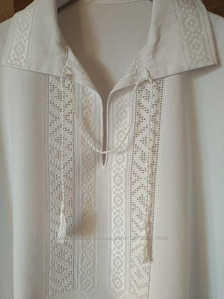 Чоловіча сорочка ручної роботи. Техніка лічильна гладь, мережка. Виконана на коломийському домотканому полотні. Ширина вишивки 24 см, довжина від коміра 40 см. Вишивка і мережка на комірі і рукавах. Колірбілий, може бути бежевий, сірий, або меланжевий (під джинс). Вільний