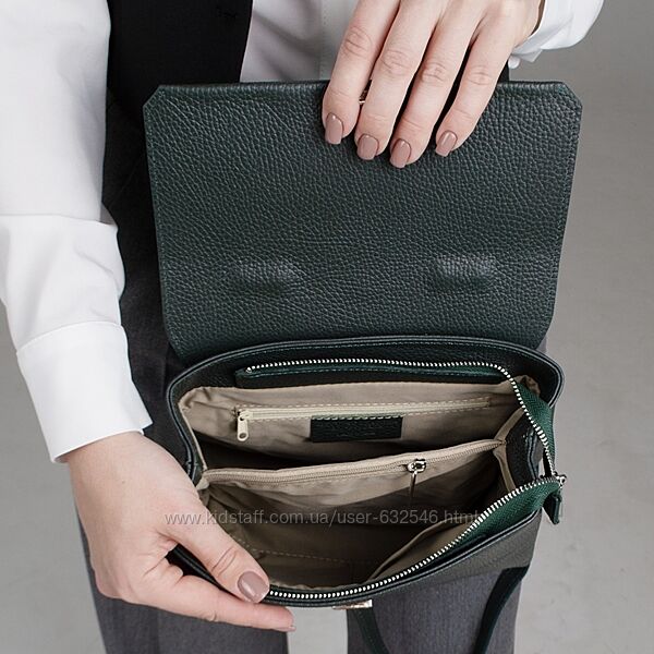 Сумка має одне відділення на блискавці, розділене на два відсіки кишенею-перегородкою, має дві кишені для телефонів і потайну кишеню на блискавці. У ній можна розмістити гаманець середнього розміру, телефон, блокнот формату А6 або павербанк, ключі, косметику. Розмір: 26 x 19 x 9 см. Ручки: Шкіряні маленька не знімна і велика регульована, що знімається. Матеріал: натуральна шкіра флотар. Жорсткість: Середня. Підклад: Текстильна. Колір фурнітури Темний нікель. Країна виробник: Італія.