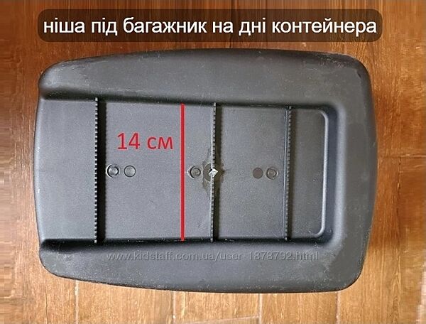 Кріпиться до багажника за допомогою червоних болтів і пластин, болти проходять через дно контейнера.