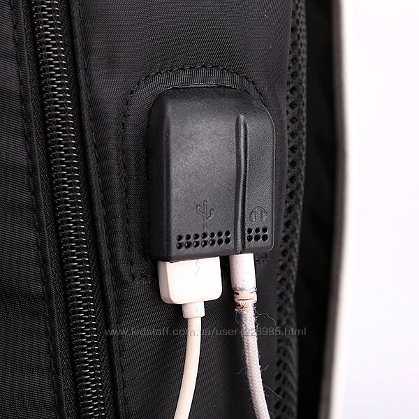 Рюкзак оснащен зовнішнім портом USB (USB-кабель і кабель для навушників — у комплекті) — просто вставте блок живлення (не входить до комплекту) у рюкзак і під´єднайте його до USB, і порт, розташований зовні рюкзака буде чудовим джерелом для заряджання телефона або інших подібних пристроїв.