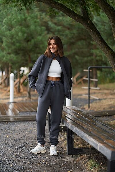 Оверсайз бомбер вільного крою на блискавці в єдиному розмірі, з врізними кишенями по боках, по низу рібана, манжети з кашкорсе, опущене плече.Штани джогери прямого крою на еластичній резинці талії + шнурок, з бічними кишенями , манжет на резинці.