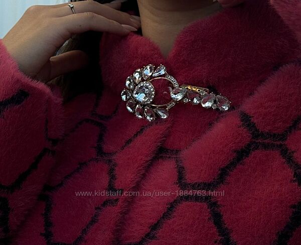 Має невеличкий комірець доповнений брошкою та пару кишень.