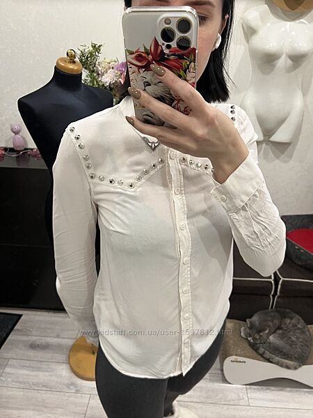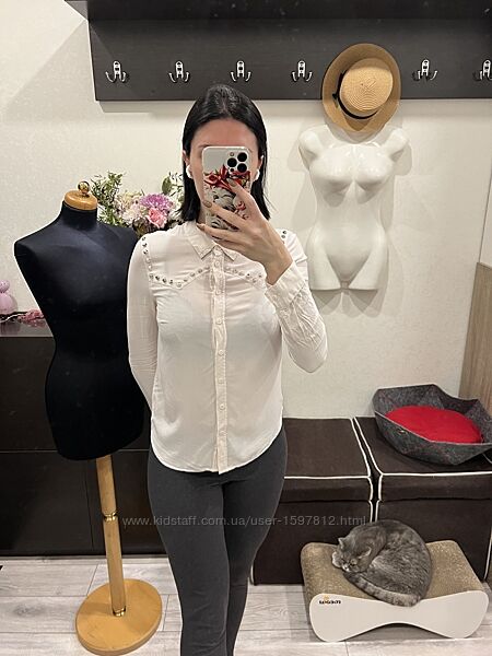 Артикул - 8954836Блузка в дуже гарному стані, дефектів немає. Декорована металевими елементами, всі на місці. Колір між молочним та блідо-рожевим. Тканина трохи просвічує. Якщо білизна чорна, то буде видно.