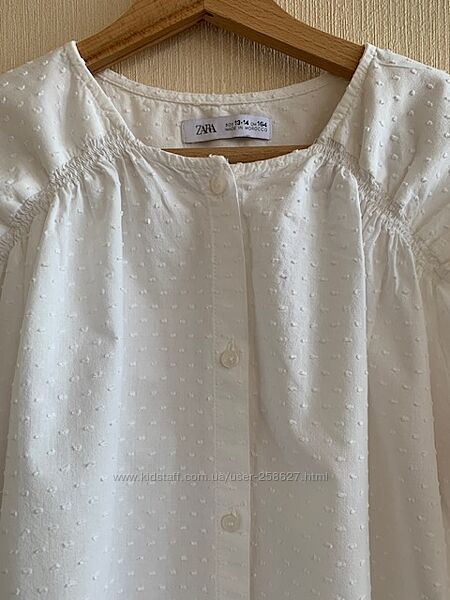 Блуза Zara р.13-14/164 см. В ідеальному стані. Склад: 100% бавовна. Заміри: напівоб´єм грудей-49 см. довжина по спинці-64 см, спереду -62см. довжина рукава від шиї-64см.