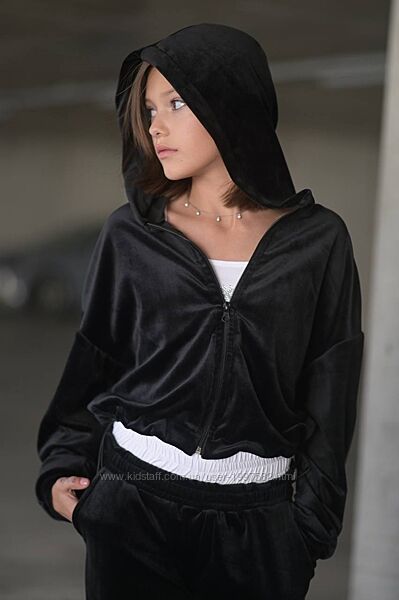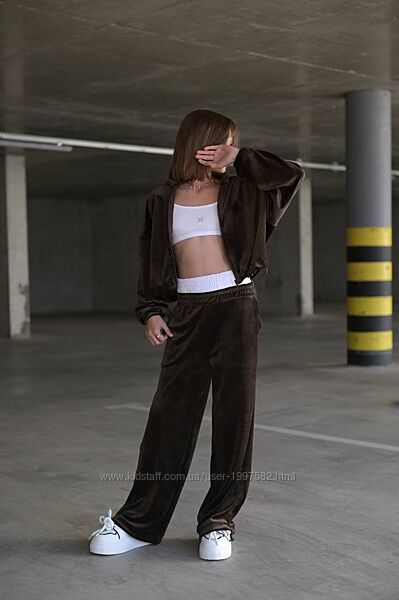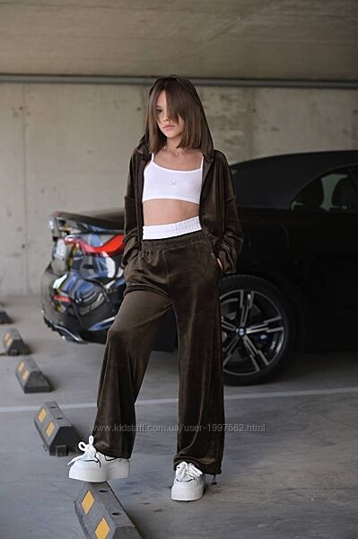 Штани палаццо регулюються резинками на фіксаторах, які перетворюються в джогери, подвійний пояс. Кофта внизу на резинці з фіксаторами