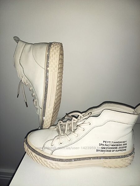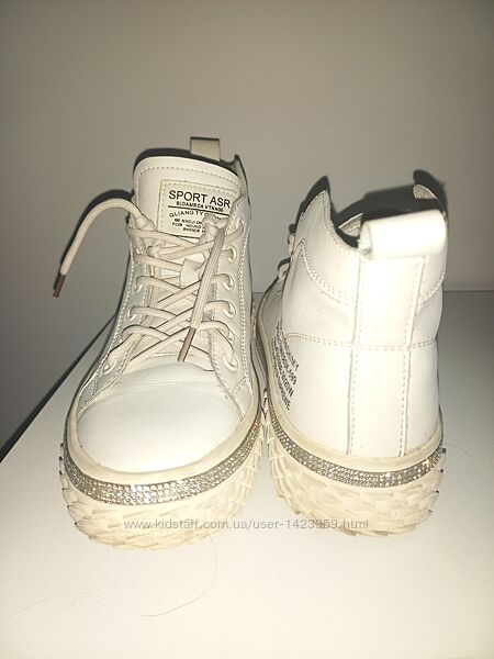 Кеды prego натуральная кожа белый 38р полномерныйКлассные модные кеды из натуральной мягкой плотной белой натуральной кожи, кожа внутри и кожаная стелька 24,5см, резиновая не стёртая подошва в высоту 3-4см, кант из стразов, на шнуровке. Идеальное состояние без изъянов, царапин или потёртостей. всё гуд!) Покупала себе уже б/у-позарилась на красоту, но у меня 36 размер стелька 23,5см...уже и две стельки вкладывала, таки нет-они полномерный 38-й размер, одела пару раз, да так и стоят в шкафу.