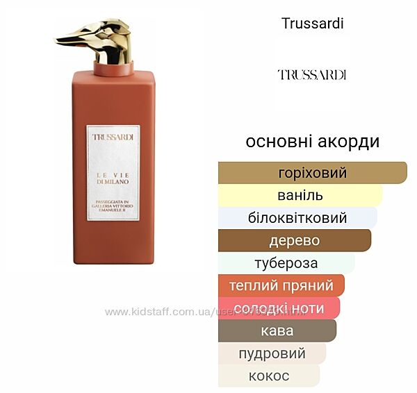 Представник бутикової лінійки Trussardi, присвяченої видатним місцям столиці моди, Мілану. Під час створення цієї композиції Жюлі Массе надихався атмосферою Galleria Vittorio Emanuele II: ось, втомившись від шопінгу, ви обрали затишний столик у кав´ярні і насолоджуєтесь еспресо зі шматочком панетоне. До нього турботливий кондитер щедро додав лісового горіху – обсмаженого, з відчутною гірчинкою. Так звучить Passeggiata In Galleria Vittorio Emanuele II: спочатку горіхом і кавою із дрібкою кориці, трохи згодом – кокосом та жасміном. Затишний, спокійний, аромат ідеально підходить для тих днів, коли хочеться нарешті відпочити від повсякденної метушні.