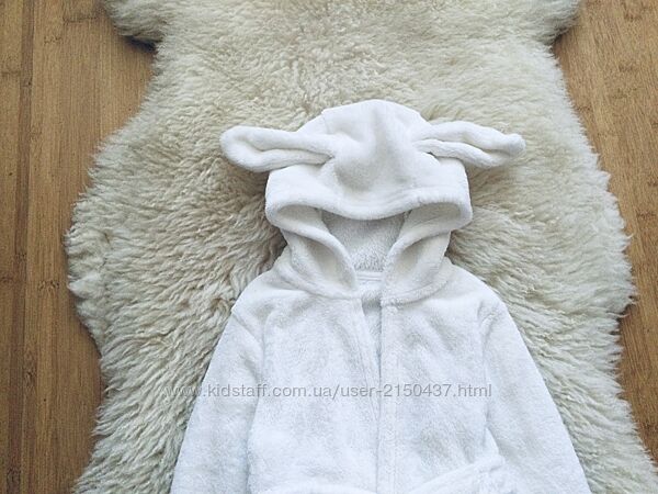 Next 1-2 рок., 86 зріст флісовий, махровий, пухнастий халат з Зайкою і вушками на капюшоні. білосніжний, теплий, банний, на море або в басейн. Стан: нового, зав´язується на талії пояском. є Кишені. довжина 48; рукав від вороту 36Другие объявления продавца