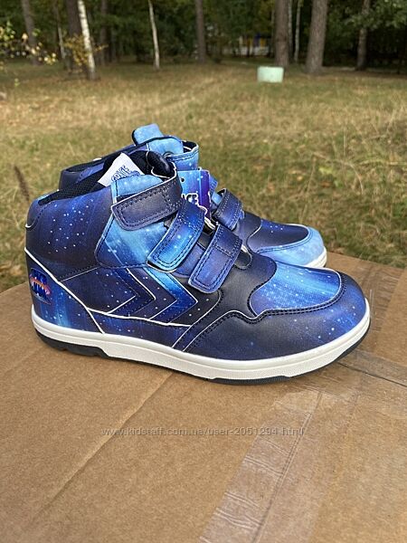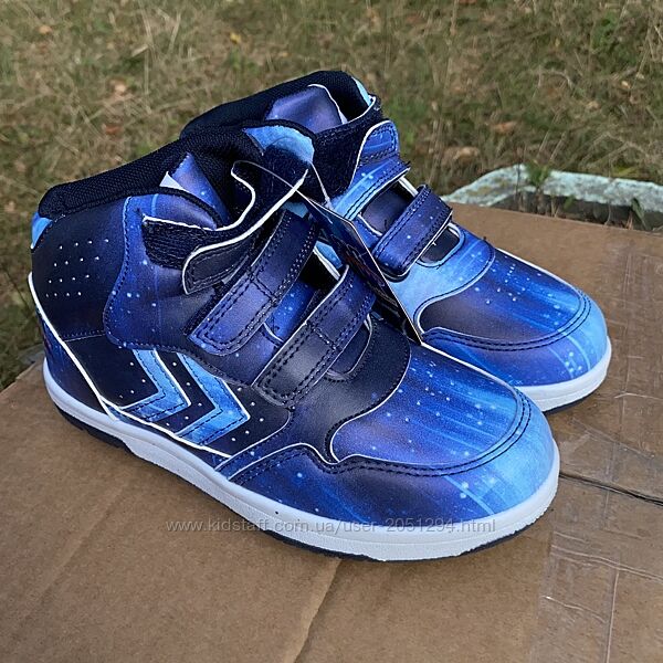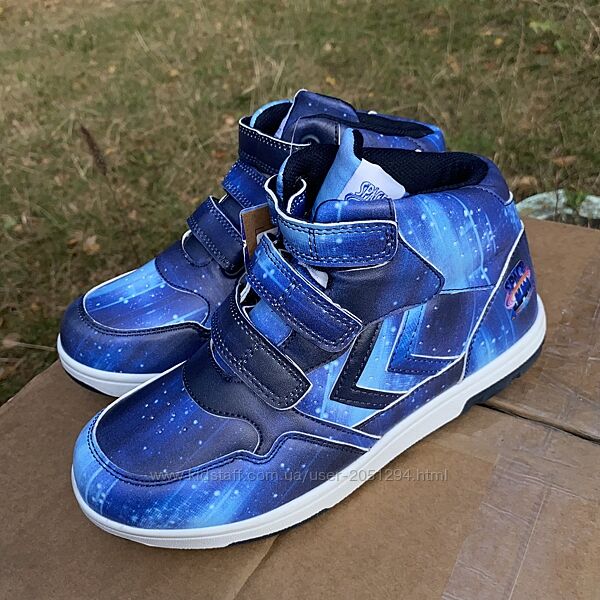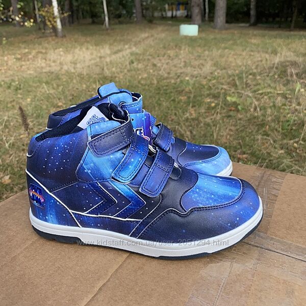 Демісезонні дитячі черевики на хлопчика , снікерси, високі кросівки, хайтопи на липучкахHummel із серії Space Camden High Jr. Ця модель була присвячена космічній тематиці, унікальна за своєю кольоровою гамою. Легкі та зручні, комфортно одягаються за рахунок 3-х липучок. Кросівки поєднують у собі деталі Space Jam та класичні фірмові деталі Hummel®, мають вентиляційні отвори та м´які манжети.