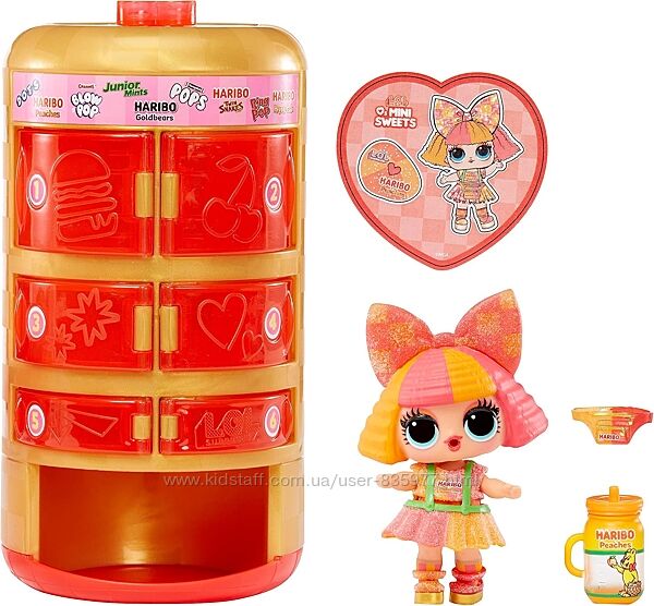 (1) лялька Lol Surprise Loves Mini Sweet;(2) Наряд;(3) взуття;(4) пляшечка;(5) аксесуар;(6) допоміжне обладнання;(7) Сумочка;(8)