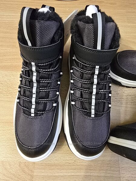 Водонепроникні утеплені високі черевики з м’яким краєм і язичком, еластичною шнурівкою та петлями на липучках спереду. Світловідбиваючі деталі та петля ззаду. Пухнаста підкладка та устілки з технічної піни Cellfit™ для додаткового комфорту. Грубі підошви з малюнком знизу для гарного зчеплення. Висота підошви 4 см.Сезон єврозима