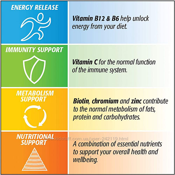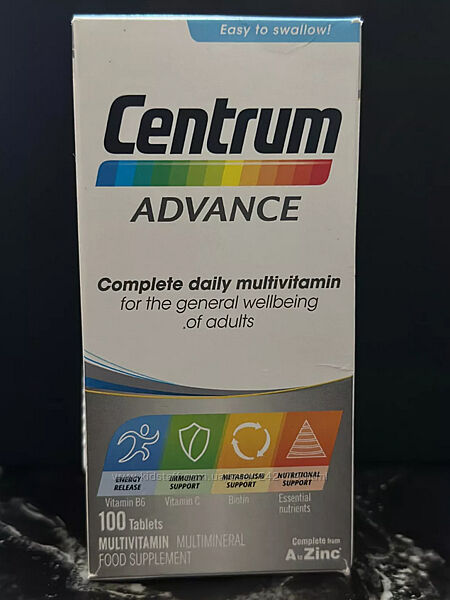 Centrum Advance Multivitamin розроблений для того, щоб допомогти вам задовольнити ваші потреби в харчуванні та підтримати ваше здоров´я та благополуччя. Вітамін B12 та B6 допомагають отримати енергію з вашого раціону, вітамін C підтримує нормальну функцію імунної системи, біотин, хром та цинк сприяють нормальному метаболізму жирів, білків та вуглеводів.