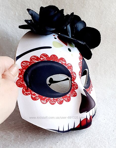 Пропоную карнавальну маску Santa Muerte . Матеріал м´який, покритий тканиною. Уживана 1 раз акуратно, стан дуже добрий, дефектів немає, дивіться фото.Розмір вказано на 5-6 років, але вона велика, примірно 20 х 20 см.