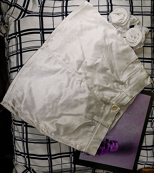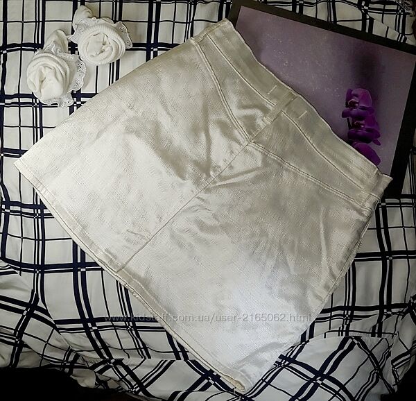 Белая юбка с небольшим шницелем сзади (6 см), двумя боковыми карманами, застёгивается на молнию и пуговицу.