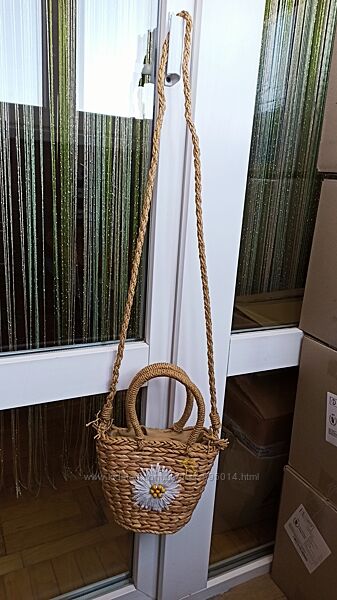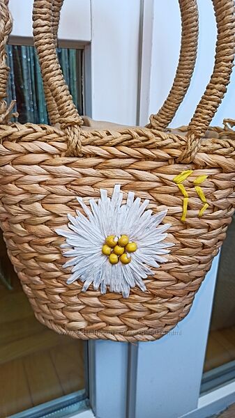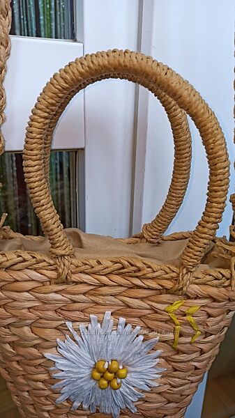 Плетеная сумка из соломы. Смотрится очень мило) В хорошем состоянии. Есть длинная ручка (на плечо) и две коротких, чтобы носить в руках. Внутри вшит мешочек на затяжке + один небольшой карман. Украшена вышитой ромашкой с бусинами. Небольшая, но вместительная - кошелек, телефон, ключи и т.п. поместятся. Очень стильная, для лета будет супер)Другие объявления продавца