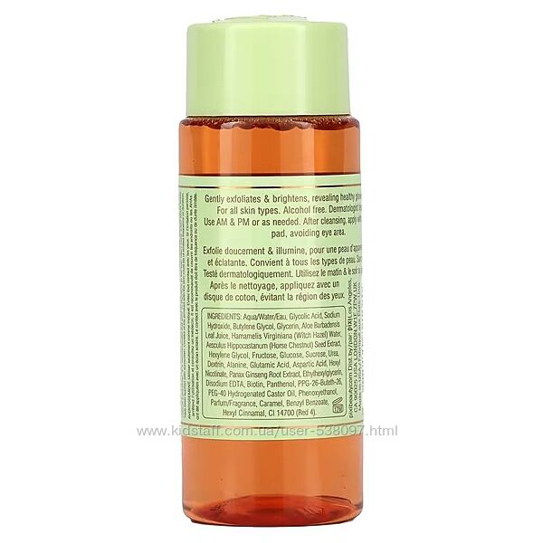 Вода, гликолевая кислота, бутиленгликоль, глицерин, гидроксид натрия, сок листьев алоэ вера (aloe barbadensis), вода из гамамелиса (hamamelis virginiana), экстракт семян конского каштана (aesculus hippocastanum), гексиленгликоль, фруктоза, глюкоза, сахароза, мочевина, декстрин, аланин, глутаминовая кислота, аспарагиновая кислота, гексил никотинат, экстракт корня женьшеня (panax ginseng), этилгексилглицерин, двунатриевая ЭДТК, биотин, пантенол, ППГ-26-бутет-26, ПЭГ-40 гидрогенизированное касторовое масло, феноксиэтанол, отдушка (парфюмерная композиция), карамель (краситель), краситель красный 4 (CI 14700).