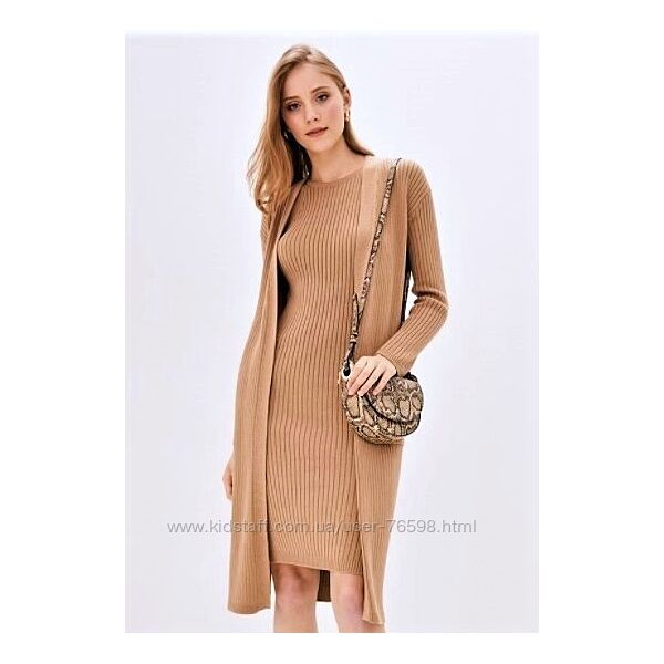 Кардиган + платье = комплект новый с бирками Качественно связанный комплект , отличная пряжа. Состав : 50% хлопок/ 50% акрил Размер указан 46-48, но реально маломерит на размер и идеально подойдет на наш 44-46. На наш 48-й мал однозначно!! Замеры указаны в нерастянутом состоянии. Растяжимость за счет вязки в рубчик очень высокая (максимально +20 см к каждому замеру в ширину). Но тем не менее на размерах 44-46 сядет по фигуре, а на 48-й слишком плотно будет облегать, , особенно платье. Замеры платья : - полуобхват груди (ширина между подмышками) - 40 см - полуобхват талии - 40 см - полуобхват бедер - 40 см - длина платья - 105 см Замеры кардигана (линия плеча приспущена): - полуобхват между подмышками - 45 см; - полуобхват талии - 45 см; - полуобхват по нижнему краю - 45 см; - длина рукава- 55 см от плеча /45 см от подмышки; - ширина плеч - 45 см; - длина плечевого шва - 17 см; - длина кардигана - 105 см
