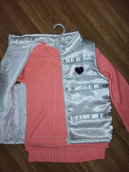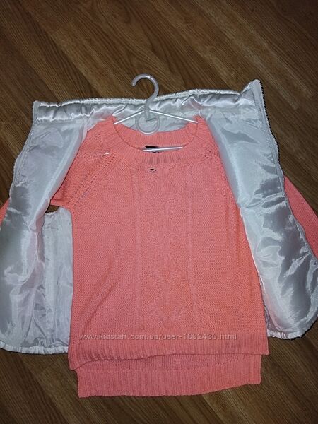 Жилетка Безрукавка біла 110р. атласна Довжина 40-42см ПОГ 36см В дуже хорошому станіСветр яскраво-морквяного кольору 116р. Рукав реглан 49см Довжина 40см Ширина 45см Нитка х-б У дуже хорошому стані