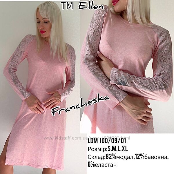 Жіноча нічна сорочка з довгим рукавом від українського виробника ТМ ELLEN (LDM 100/09/01) з колекції "TEA ROSE" можна купити в нашому інтернет магазині Francheska.Нічна сорочка виконана з якісного модалу, довжиною трохи нижче колін. Модель вільного крою, з довгими рукавами та круглим вирізом горловини, внизу з боків для зручності є розрізи. Рукава по всій довжині прикрашені широкими вставками з мережива.