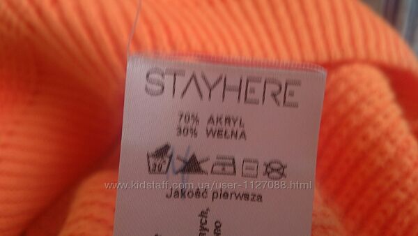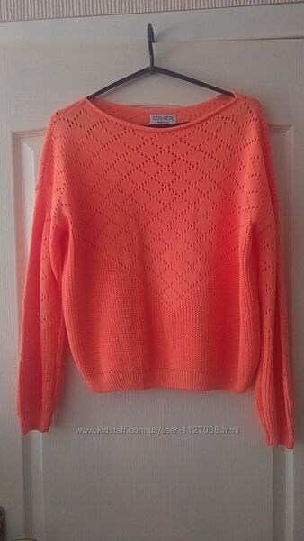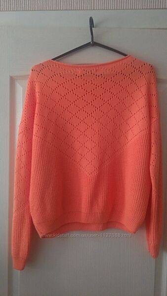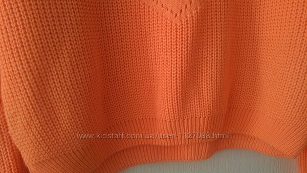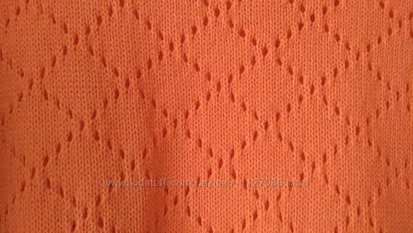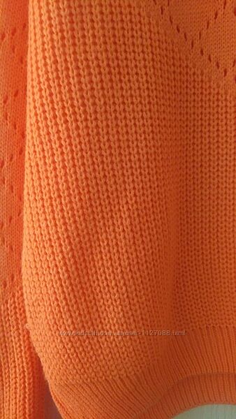 Симпатичний короткий джемпер помаранчевого кольору. Розмір XL. Колір без рожевого відтінку - саме оранжевий, або помаранчевий. Верхня частина джемпера по переду, спинці й рукавах - це ажурна ромбовидна в´язка. Стан практично новий, за винятком дефекту - майже непомітної затяжки на нижній частині (останнє фото). Заміри: -довжина рукава до горловини 73 см (рукав трохи спущений); -довжина по спинці 56 см; -ПОГ 56 см; -ширина внизу по резинці 44 см. Матеріал м´який, приємний до тіла, без відчуття синтетики. Середньої щільності. Тягнеться. У складі 70% акрил, 30% вовна. Виробник - Польща. Повернення не передбачене.