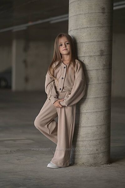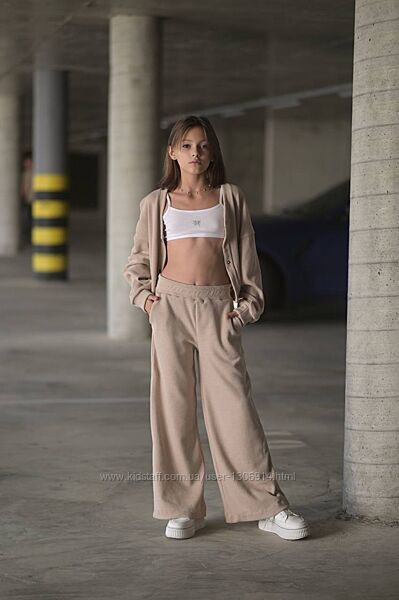 Штани палаццо регулюються резинками на фіксаторах, які перетворюються в джогери, подвійний пояс. Кофта внизу на резинці з фіксаторами.