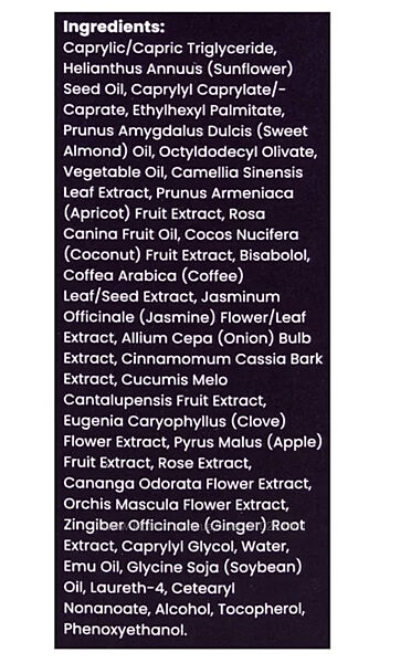 Каприловый/каприновый триглицерид, масло семян подсолнечника, Подсолнечное масло, каприлил-каприлат/капрат, этилгексилпальмитат, масло Prunus Amygdalus Дульсис (сладкое миндальное масло), оливковое масло олефины камелии, экстракт плодов сосны масло, экстракт плодов кокоса нудифера (кокосовый орех), бисаболол, экстракт листьев/семян кофе арабика (кофе), экстракт цветов/листьев жасмина лекарственного (жасмина), экстракт луковицы Allium сера (лук), экстракт коры корицы кассии, экстракт плодов Cucumis Мело cantalupensis, экстракт цветка Eugeni Caryophyllus (гвоздика), экстракт фруктов пирус малус (яблочный), экстракт розы, экстракт цветка канадги Odorata, экстракт цветка малины Ятрышник, экстракт корня Zingiber лекарственный (имбирь), каприлилгликоль, аква (вода, вода), масло эму, глицин-соя (соевое) масло, лаурет-4, цетеарил-нонаноат, спирт, денат., феноксиэтанол.