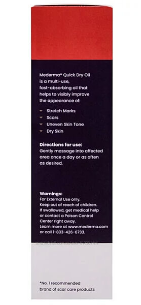 Mederma® Quick Dry Oil - это универсальный продукт, предназначенный для удаления шрамов, растяжек, неровного тона и сухой кожи. Это быстросохнущее масло следует аккуратно втирать в пораженные участки не реже одного раза в день или так часто, как нужно. Это уникальная смесь сложных масел, растительных компонентов и других ингредиентов.