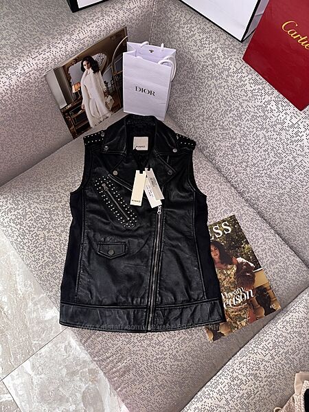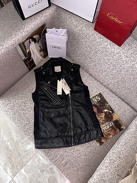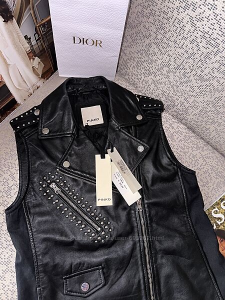 Шкіряний жилет Pinko Оригінал. На фото добре видно якість шкіри. Воно просто бездоганне. Розмір відповідає. Ширина в грудях 46..Плечі 38. Довжина по спинці 63. Підійде на кілька розмірів хс,с,м. Жилет замовляла у Баєра Дорого! Шкіра натуральна! Позаду шкіра+тканина.