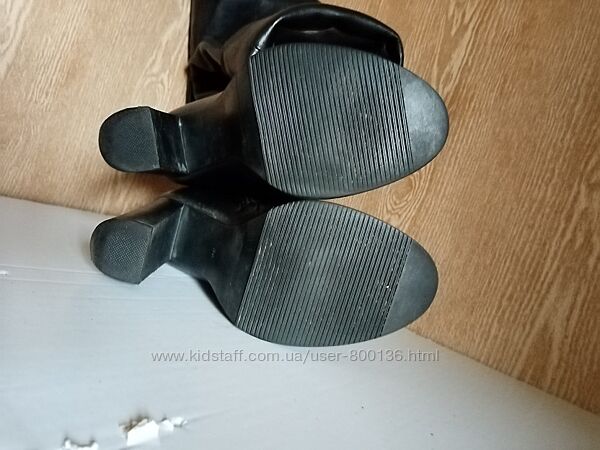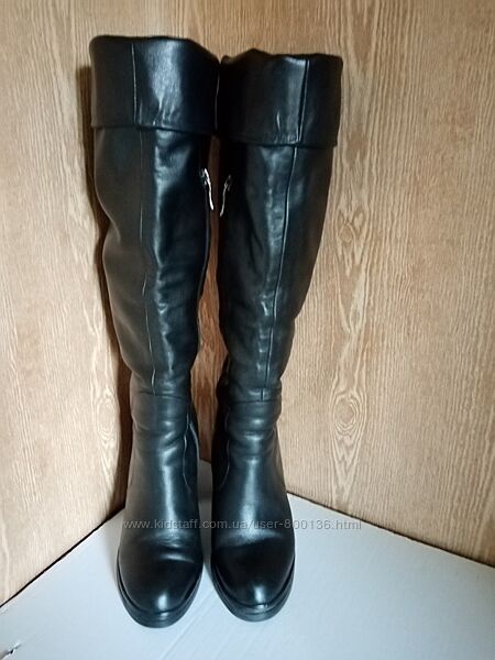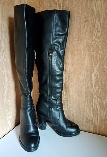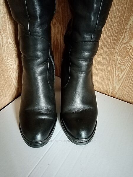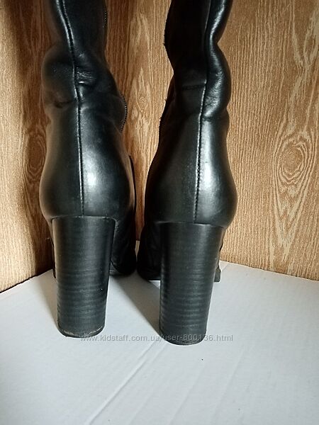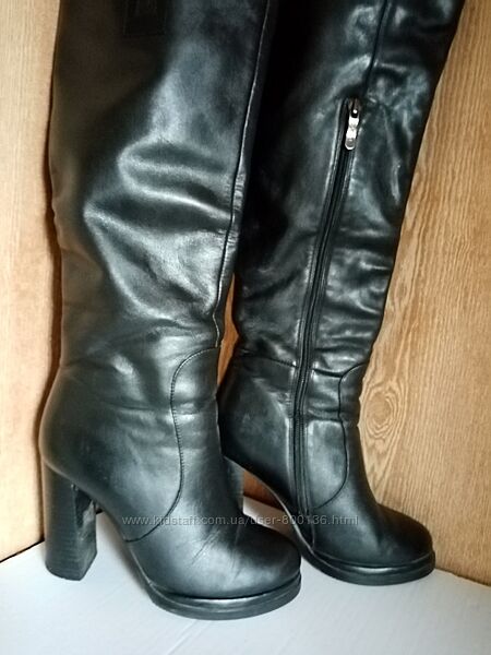 Б/В. Якісні, зручні, теплі зимові чоботи - ботфорти на 36 розмір. Довжина по устілці 23 см. Чоботи шкіряні. В середині натуральне хутро (висота по пятці 8 см) вище штучне хутро на тканині. Устілка хутряна. Зручна колодка. Висота підбора (каблука) 10 см. Висота платформи 1,5 см. Висота від підошви до гори 55 см. Можливий заворот 8 см. Ширина гомілки зверху напівобхват 17 см. Блискавка до гори не доходить. Довжина блискавки 34 см. (що дозволяє зручно вдягати чоботи). Чоботи без подряпин, потертостей та без дірок. Стан дивитись по фото. Ньюанс: Зверху по боках загубились заклепки з ємблемою. Дивіться фото.Доставка: Укр пошта, Нова пошта. Доставка за рахунок отримувача.