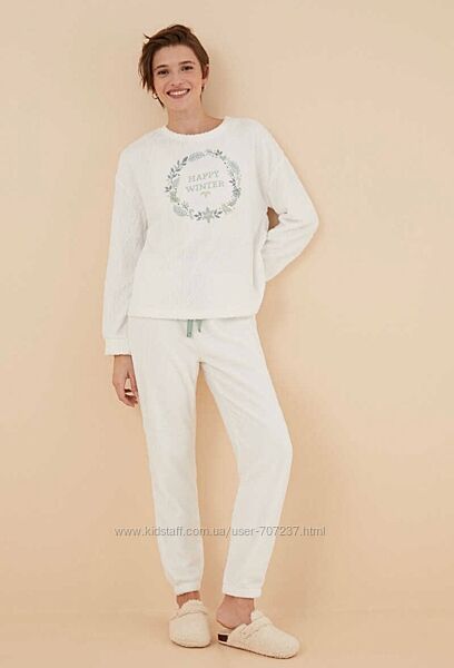 Довга піжама ідеальна для жінок: спати чи перебувати вдома, не мерзнувши ні крапельки. Верх із мехового флісу із жакардовим ефектом та довгий ворс із м´якого флісового трикотажу.Круглий виріз, занижені рукави та регульований пояс зі стрічкою в тон принту.