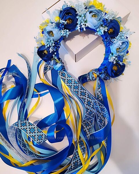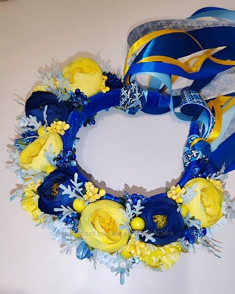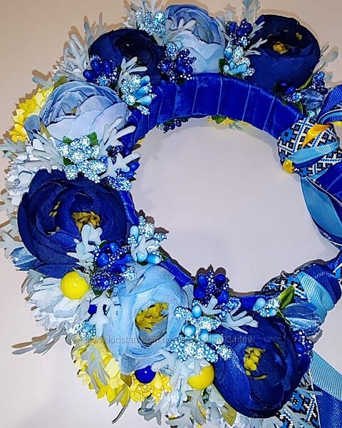 Віночок двухсторонній. Поєднання синьо-жовтих квітів з одної сторони, та синьо-блакитних з другої. Вдало підкреслить декілька образів одночасно. Зручно на фотосесії під зміну одягу. Багато стрічок, однотонних та з візерунками. Під вишиванку, сукню, сучасний образ. В школу, в садочок. На подарунок. Підійде дівчатам від 5 років і дорослим.