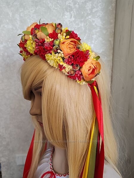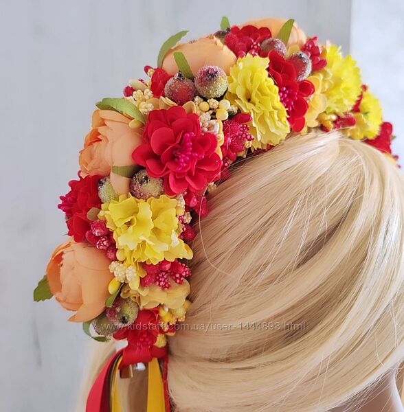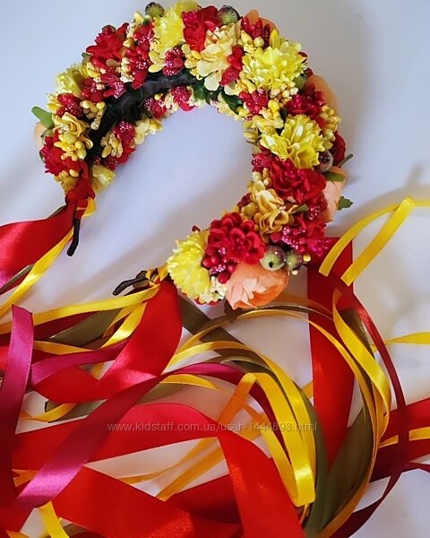 Барвистий, яскравий, неймовірний осінній віночок. До свята, фотосесії. Підійде під кольорову та однотонну сукню. Підкреслить ваш образ на осінньому святі. Стрічки знімаються. Основа металевий обруч.